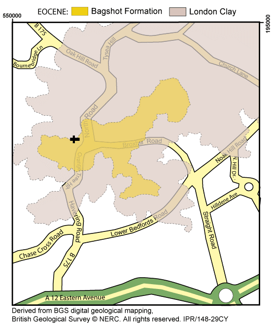 The geology of Havering village consists of deposits of clays, gravels and sands variously classed as ‘bedrock’ and ‘superficial’ deposits. Clays and sands record two periods of very different extreme climate. The youngest, surficial deposits are associated with an ice age when most of Britain was covered by thick ice. The older sedimentary rocks were deposited during a period when Havering was under warm tropical seas.