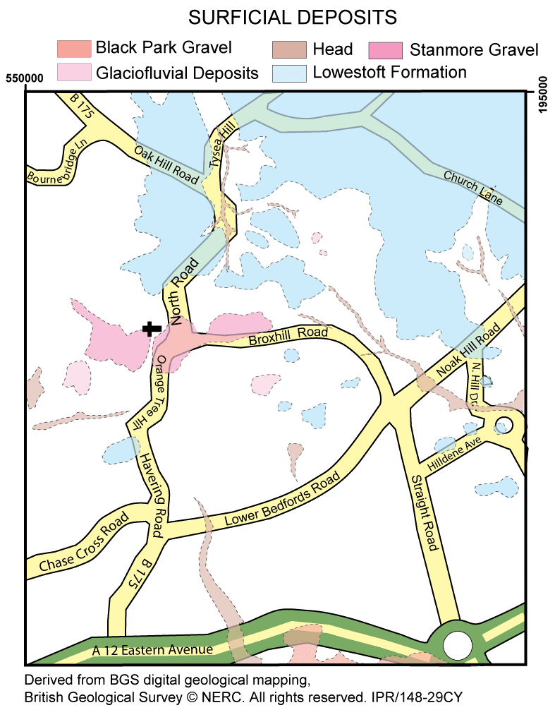 The British Geological Survey (BGS) identify five types of superficial deposit in the Havering area, shown on the map below:
